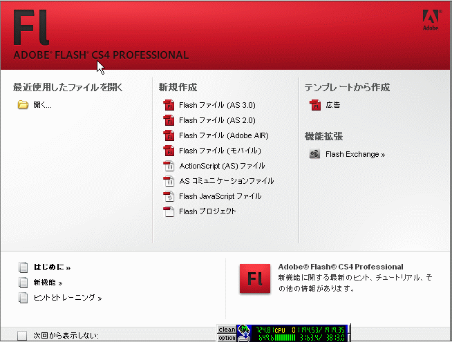 インストールに苦労した。DVD2枚のインストールディスクだが、1枚目の途中で進まなくなった。市販のソフトでインストールに失敗したのは初めてだ。必要構成を見直してみると、敷居は高い。次の日、QuickTimeをインストールした後、CS4のインストールは止まることはなかった。2枚目のディスクでアクセス音がカシャカシャとうるさかったが、インストールは成功した。
